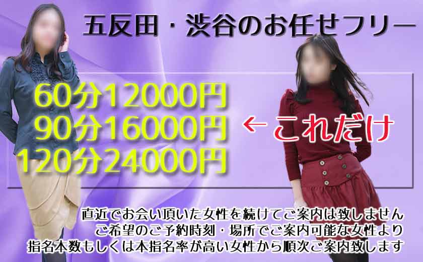 五反田・目黒・恵比寿・渋谷の4エリアでご利用OKで60分コースよりご用意致しました。